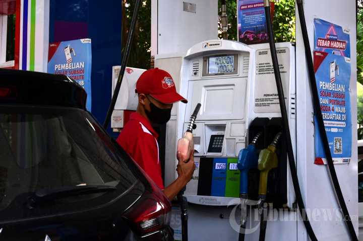 Petugas mengisikan BBM jenis Pertalite di SPBU Jalan Bandung, Kota Malang, Jawa Timur, usai Pemerintah menaikkan harga bahan bakar minyak (BBM), Sabtu (3/9/2022) siang. SPBU Jalan Bandung, Kota Malang, sempat menghentikan beberapa saat penjualanya sebelum Pemerintah mengumumkan kenaikan harga BBM. Presiden Joko Widodo (Jokowi) secara resmi mengumumkan kenaikan harga BBM yakni BBM jenis Pertalite dari Rp 7.650 per liter menjadi Rp 10.000 per liter, Solar subsidi dari Rp 5.150 per liter menjadi Rp 6.800 per liter, dan Pertamax dari Rp 12.500 per liter menjadi Rp 14.500 per liter yang mulai berlaku pada Sabtu (3/9) pukul 14.30 WIB. SURYA/PURWANTO