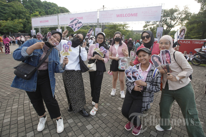 Penggemar BLACKPINK yang biasa disebut Blink berfoto sebelum menonton konser di kawasan komplek Gelora Bung Karno (GBK) Jakarta saat konser BLACKPINK, Sabtu (11/3/2023). Konser bertajuk BLACKPINK World Tour Born Pink digelar selama dua hari pada tanggal 11 dan 12 Maret 2023. Antusias para Blink terlihat dengan padatnya kawasan GBK. TRIBUNNEWS/HERUDIN