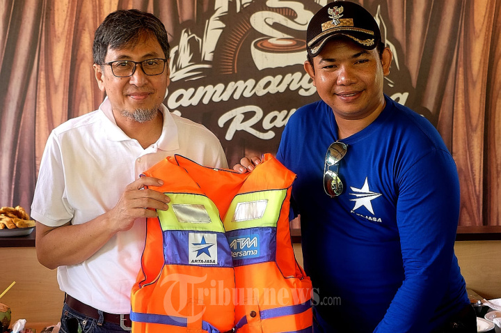 TRIBUNNEWS.COM, JAKARTA - Direktur Utama Artajasa M. Ma’ruf (kiri) secara simbolis menyerahkan bantuan Corporate Social Responsibility (CSR), berupa 15 unit alat memasak bagi pelaku UMKM, 100 unit rompi pelampung dan 115 kaos serta topi bagi pengemudi perahu, yang diterima Kepala Desa Salenrang, Baso, di daerah wisata Rammang-Rammang, Desa Salenrang, Kabupaten Maros, Provinsi Sulawesi Selatan, Rabu (14/12/2022). Bantuan itu merupakan bentuk dukungan Artajasa, perusahaan penyedia jaringan infrastruktur sistem pembayaran terdepan di Indonesia, atas kemajuan pariwisata dan UMKM di Rammang-Rammang yang kini telah diakui sebagai lokasi wisata unggulan di Provinsi Sulawesi Selatan /IST/HO