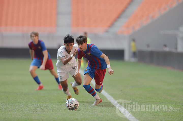 Pesepakbola Barcelona U-18 berebut bola dengan pesepakbola Bali United U-18 pada lanjutan pertandingan International Youth Championship di Jakarta International Stadium (JIS), Jakarta Utara, Minggu (17/4/2022). Pada pertandingan tersebut, Barcelona U-18 menggulung Bali United U-18 dengan skor 4-0. TRIBUNNEWS/HERUDIN