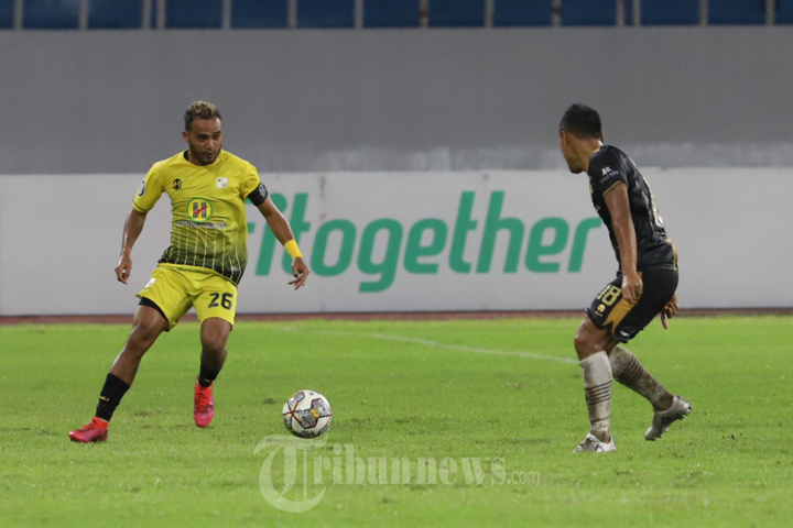 Pemain Barito Putera Rizky Pora mencoba melewati pemain Dewa United Jajang S pada pertandingan Liga 1 di Stadion Jatidiri, Semarang, Jawa Tengah, Minggu (11/12/2022). Hingga babak kedua Dewa United dan Barito Putera masih belum dapat mencetak Gol ke gawang lawan. Tribunnews/Jeprima