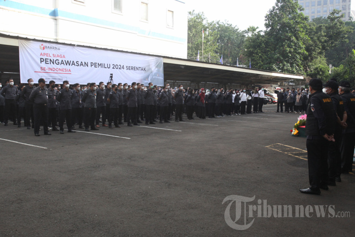 Suasana apel siaga pengawasan Pemilu 2024 serentak se-Indonesia di Jakarta, Selasa (14/6/2022). Kegiatan tersebut dilakukan dalam rangka pemantapan kesiapan jajaran pengawas pemilu menghadapi pelaksanaan setiap tahapan Pemilu 2024. Tribunnews/Jeprima