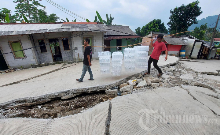 Warga melintas di jalan yang terbelah akibat pergerakan tanah di Kampung Curug, Desa Bojongkoneng, Kecamatan Babakanmadang, Kabupaten Bogor, Jawa Barat, Jumat (16/9/2022). Badan Penanggulangan Bencana Daerah (BPBD) Kabupaten Bogor mencatat akibat pergeseran tanah, 18 unit rumah mengalami kerusakan serta menyebabkan retakan-retakan di tanah, dinding, plafon dan lantai rumah warga serta akses jalan sudah tidak bisa dilewati oleh kendaraan roda empat.Wartakotalive.com/Alex Suban
