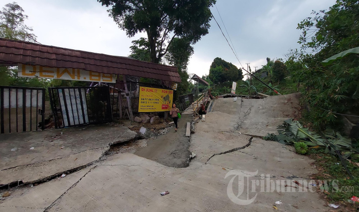 Warga melintas di jalan yang terbelah akibat pergerakan tanah di Kampung Curug, Desa Bojongkoneng, Kecamatan Babakanmadang, Kabupaten Bogor, Jawa Barat, Jumat (16/9/2022). Badan Penanggulangan Bencana Daerah (BPBD) Kabupaten Bogor mencatat akibat pergeseran tanah, 18 unit rumah mengalami kerusakan serta menyebabkan retakan-retakan di tanah, dinding, plafon dan lantai rumah warga serta akses jalan sudah tidak bisa dilewati oleh kendaraan roda empat.Wartakotalive.com/Alex Suban