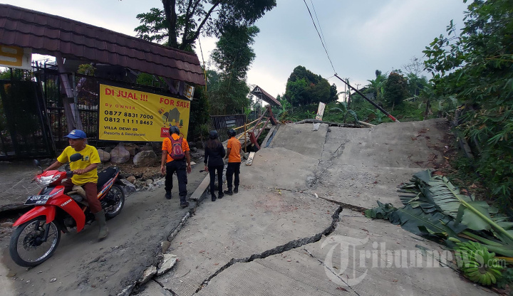 Warga melintas di jalan yang terbelah akibat pergerakan tanah di Kampung Curug, Desa Bojongkoneng, Kecamatan Babakanmadang, Kabupaten Bogor, Jawa Barat, Jumat (16/9/2022). Badan Penanggulangan Bencana Daerah (BPBD) Kabupaten Bogor mencatat akibat pergeseran tanah, 18 unit rumah mengalami kerusakan serta menyebabkan retakan-retakan di tanah, dinding, plafon dan lantai rumah warga serta akses jalan sudah tidak bisa dilewati oleh kendaraan roda empat.Wartakotalive.com/Alex Suban