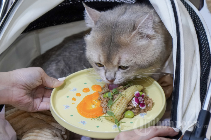 Catfluencers Kiwi British Cat mencicipi hasil food-plating dengan menggunakan produk Purina Fancy Geast sebagai bahan utama yang disiapkan oleh Professional Food Stylist Patricia Devina di Indonesia International Pet Expo (IIPE) 2024, ICE BSD, Tangerang, Jumat (6/9/2024). TRIBUNNEWS/HO