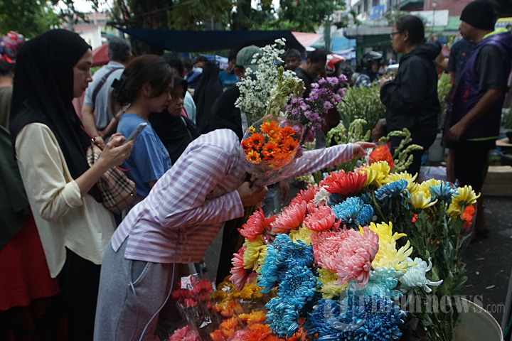 Sejumlah warga berburu bunga sedap malam di Pasar Rawamangun, Jakarta Timur, Selasa (9/4/2024). Bermacam-macam bunga warna warni dijajakan para pedagang bunga potong musiman pada momen jelang Hari Raya Idul Fitri. Harga yang ditawarkan pedagang pertangkai bunga sebesar Rp 15.000. Tribunnnews/Jeprima