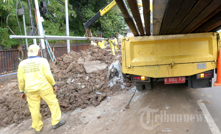 Petugas Dinas Bina Marga DKI Jakarta membongkar bekas tiang telepon yang tidak berfungsi lagi di Jalan Hasanudin, Kabayoran Baru, Jakarta Selatan, Kamis (19/5/2022). Tiang-tiang telepon tersebut tidak berfungsi lagi karena kabel telah ditanam di bawah tanah. Warta Kota/Henry Lopulalan