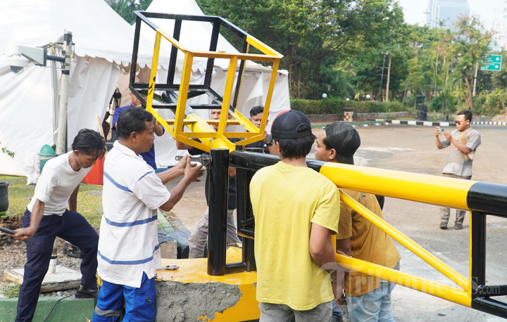 Sejumlah pekerja sedang membongkar portal di pintu masuk Hotel Sultan, Tanah Abang, Jakarta Pusat, Kamis (26/10/2023) oleh PT Indobuildco. Portal yang dipasang oleh Pusat Pengelolaan Komplek Gelora Bung Karno (PPKGBK) sejak 24 Oktober lalu ini dinilai menghalangi akses masuk tamu dan karyawan Hotel Sultan. Warta Kota/Yulianto