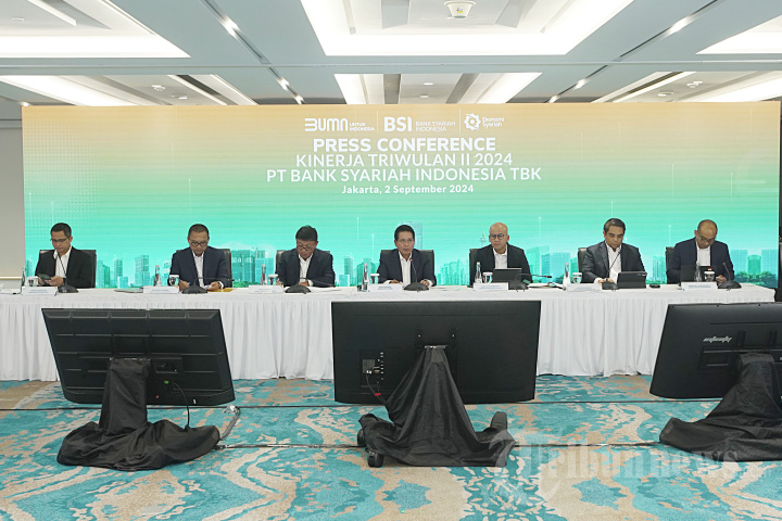 Direktur Utama BSI Hery Gunardi didampingi Wakil Direktur Utama Bob T. Ananta bersama Direktur Information Technology Saladin D. Effendi, Direktur Finance & Strategy Ade Cahyo Nugroho, Direktur Sales & Distribution Anton Sukarna, Direktur Risk Management Grandhis H. Harumansyah melakukan pemaparan kinerja triwulan II 2024 BSI di Gedung The Tower BSI, Jakarta Selatan, Senin (2/9/2024). PT Bank Syariah Indonesia Tbk (BSI) mencatatkan laba bersih mencapai Rp3,4 triliun pada kinerja keuangan kuartal II tahun 2024 atau tumbuh 20,28 persen secara year on year sehingga menorehkan pertumbuhan tertinggi di antara bank-bank di Indonesia. Tribunnews/Jeprima
