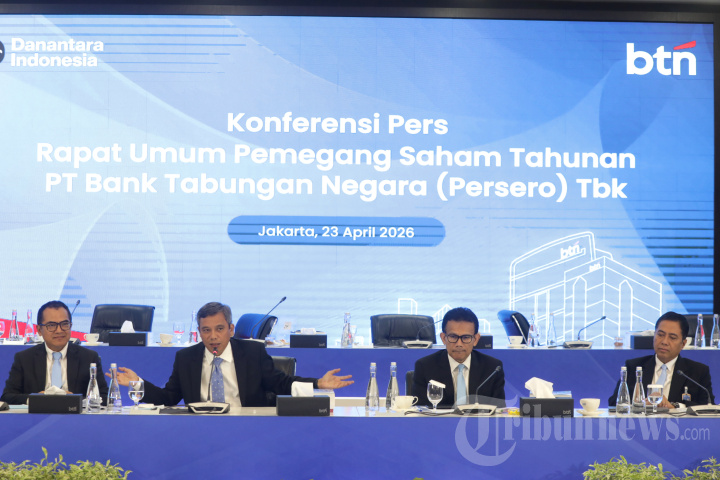Direktur Utama PT Bank Tabungan Negara (Persero) Tbk. Nixon L.P. Napitupulu (kedua kiri) bersama Direktur Human Capital and Compliance Eko Waluyo (kiri), Direktur Finance and Strategy Nofry Rony Poetra (kedua kanan) dan Direktur Consumer Banking Hirwandi Gafar (kanan) memberi keterangan usai Rapat Umum Pemegang Saham Tahunan (RUPST) Tahun Buku 2025 di Jakarta, Kamis (23/4/2026). Dalam RUPST tersebut, BTN menetapkan laba bersih 2025 sebesar Rp3,5 triliun sebagai laba ditahan untuk memperkuat permodalan dan mendorong ekspansi kredit dengan target pertumbuhan 8–10 persen pada 2026. TRIBUNNEWS/IRWAN RISMAWAN