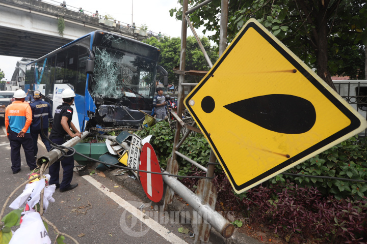 Sejumlah petugas berusaha mengevakuasi bus TransJakarta koridor 11 Kampung Melayu-Pulo Gebang yang mengalami kecelakaan di kawasan I Gusti Ngurah Rai, Jakarta Timur, Jumat (11/2/2022). Kecelakaan tersebut diduga akibat sopir hilang konsentrasi sehingga menambrak pembatas jalan dan rambu lalu lintas yang mengakibatkan bodi depan bus ringsek namun tidak menimbulkan korban jiwa. Tribunnews/Jeprima