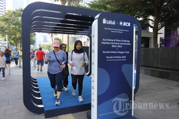 DEMAM IPHONE 17 - Pengunjung Car Free Day (CFD) Jakarta mengikuti kegiatan interaktif bertema Get Ready for the New Generation iPhone kolaborasi Blibli x BCA, Minggu (12/10/2025). Acara yang digelar di sepanjang jalur Menara Astra hingga Bundaran HI ini menjadi bagian dari pre-order iPhone 17 Series yang menghadirkan berbagai aktivitas seru seperti pengumpulan stempel di sejumlah stamp station, selfie di depan LED raksasa Grand Indonesia, serta penukaran merchandise eksklusif dan voucher belanja bagi peserta. Kegiatan ini tidak hanya menjadi ajang promosi, tetapi juga wadah edukasi bagi masyarakat mengenai keuntungan membeli produk Apple resmi di Blibli sebagai Apple Authorized Reseller. TRIBUNNEWS/HO