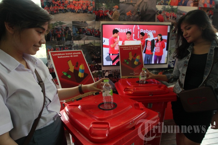Model menunjukan cara membuang material plastik yang akan diproses dalam program Plastic Reborn di Jakarta, Selasa (27/2/2018). Untuk mengkampanyekan gerakan World Without Waste, Coca Cola Foundation Indonesia meluncurkan program Plastic Reborn, yaitu program yang didesain untuk menginspirasi perubahan perilaku generasi muda Indonesia tentang pengelolaan sampah kemasan plastik. TRIBUNNEWS/HO