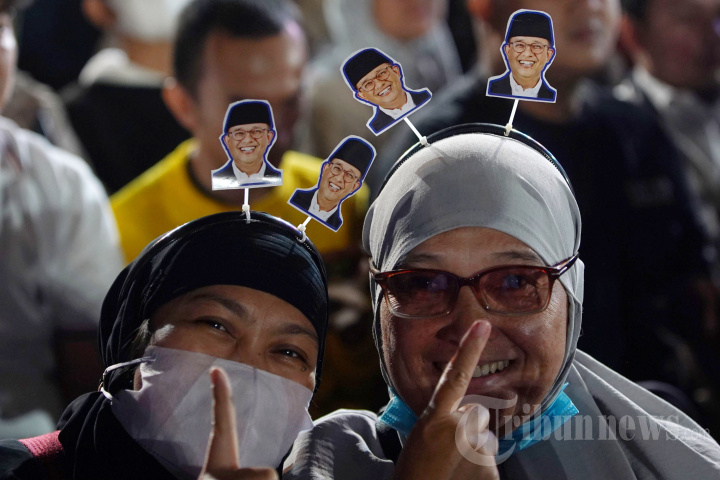 Pendukung Calon Presiden nomor urut 1 Anies Baswedan saat acara Desak Anies bersama buruh dan ojol di JIExpo Kemayoran, Jakarta, Senin (29/1/2024). Dalam acara Desak Anies tersebut, Anies menegaskan akan mengkaji ulamg kebijakan yang tertuang dalam Omnibus Law UU Ciptaker dan akan mengakomodir jaminan kesehatan khusus dari kemenaker untuk para ojek online (ojol). TRIBUNNEWS/IRWAN RISMAWAN