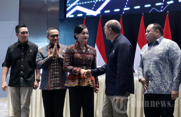 PASAR MODAL - Ceo Badan Pengelola Investasi Danantara Indonesia Rosan Roeslani (kedua kanan) bersama Pejabat Sementara Ketua Dewan Komisioner OJK Frederica Widyasari Dewi (tengah), Pejabat Sementara Kepala Eksekutif Pengawas Pasar Modal, Keuangan Derivatif, dan Bursa Karbon OJK Hasan Fawzi (kedua kiri), Direktur Bursa Efek Indonesia Jeffrey Hendrik (kiri) dan Direktur Investasi Danantara Indonesia Pandu Sjahrir (kanan) saat acara Dialog Bersama Pelaku Pasar Modal di Bursa Efek Indonesia, Jakarta, Minggu (1/2/2026). Dialog tersebut membahas 8 rencana aksi percepatan reformasi integritas pasar modal Indonesia. TRIBUNNEWS/IRWAN RISMAWAN