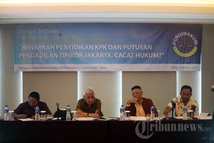 Moderator acara, Haryadi Ismail, Mantan Hakim Agung dan Konstitusi, Laica Marzuki, Pakar hukum pidana Universitas Padjadjaran, Romli Atmasasmita, dan Advokat, Firman Wijaya (kiri-kanan) mengemukakan pandangan dalam acara diskusi yang digelar Forum Diskusi Wartawan Hukum Kuningan, di Jakarta, Sabtu (5/10/2013). Diskusi yang mengambil tema 'Catatan Kritis Kasus Suap Impor Daging Sapi: Benarkah Penyidikan KPK dan Putusan Pengadilan Tipikor Jakarta, Cacat Hukum?' tersebut menyoroti kasus korupsi yang melibatkan Partai Keadilan Sejahtera (PKS). (TRIBUNNEWS/DANY PERMANA)