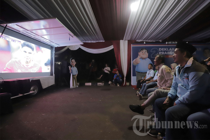 Tim Kampanye Nasional (TKN) Prabowo-Gibran menggelar nonton bareng Piala Asia 2024 di depan kediaman Prabowo Jalan Kertanegara, Jakarta, Rabu (24/1/2024). Nonton bareng Piala Asia Indonesia vs Jepang ini bersama Millenial Gen Z dihadiri Wakil Ketua TKN Prabowo-Gibran, Juri Ardiantoro dengan dimeriahkan dengan iringan live akustik merupakan bentuk dukungan untuk Timnas Indonesia bertanding pada Piala Asia Cup 2023. Tribunnews/Jeprima