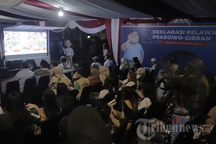 Tim Kampanye Nasional (TKN) Prabowo-Gibran menggelar nonton bareng Piala Asia 2024 di depan kediaman Prabowo Jalan Kertanegara, Jakarta, Rabu (24/1/2024). Nonton bareng Piala Asia Indonesia vs Jepang ini bersama Millenial Gen Z dihadiri Wakil Ketua TKN Prabowo-Gibran, Juri Ardiantoro dengan dimeriahkan dengan iringan live akustik merupakan bentuk dukungan untuk Timnas Indonesia bertanding pada Piala Asia Cup 2023. Tribunnews/Jeprima