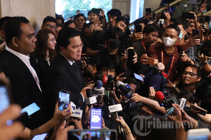 Ketua Umum Persatuan Sepak Bola Seluruh Indonesia (PSSI) 2023-2027, Erick Thohir memberikan keterangan pers usai dirinya terpilih dalam Kongres Luar Biasa (KLB) PSSI di Hotel Shangri-la, Jakarta Pusat, Kamis (16/2/2023). Dalam hasil penghitungan suara, Erick Thohir yang juga Menteri BUMN itu berhasil meraih sebanyak 64 suara, sedangkan calon lainnya, La Nyalla Mattalitti mendapatkan 22 suara. Dengan demikian Erick Thohir resmi terpilih menjadi Ketua Umum PSSI periode 2023-2027. TRIBUNNEWS/JEPRIMA