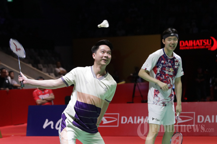 Mantan pebulu tangkis Indonesia Kevin Sanjaya Sukamuljo dan pebulu tangkis Korea Selatan Seo Seung Jae melawan pebulu tangkis Indonesia Hendra Setiawan dan Mohammad Ahsan saat exhibition match disela-sela acara perpisahan bertajuk 'Tribute to The Daddies' sebelum laga final Indonesia Masters 2025 di Istora Senayan, Jakarta, Minggu (26/1/2025). Exhibiton match terebut menjadi laga akhir pebulu tangkis Hendra Setiawan dan Mohammad Ahsan di Istora Senayan setelah menyatakan pensiun dari duni buku tangkis. TRIBUNNEWS/IRWAN RISMAWAN