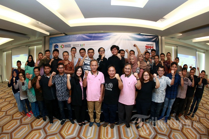 Telekomunikasi Radio SDPPI Kementerian Komunikasi dan Informatika Indra Utama dan Ketua Umum Asosiasi IoT Indonesia Teguh Prasetya berfoto dalam gelaran hands on workshop IoT Makers Creation 2019, di Tangerang, Kamis (25/7/2019). Makerslokal internet of things (IoT) di Tangerang mencoba platform lokal yang dikembangkan oleh SAM Element. TRIBUNNEWS/HO