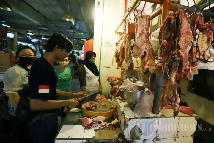 Pedagang saat memotong daging sapi di Pasar Senen, Jakarta Pusat, Sabtu (17/5/2020). 10 hari jelang Hari Raya Idul Fitri harga daging sapi naik menjadi Rp 130 ribu meski begitu permintaan untuk daging sapi tetap tingi. Tribunnews/Jeprima