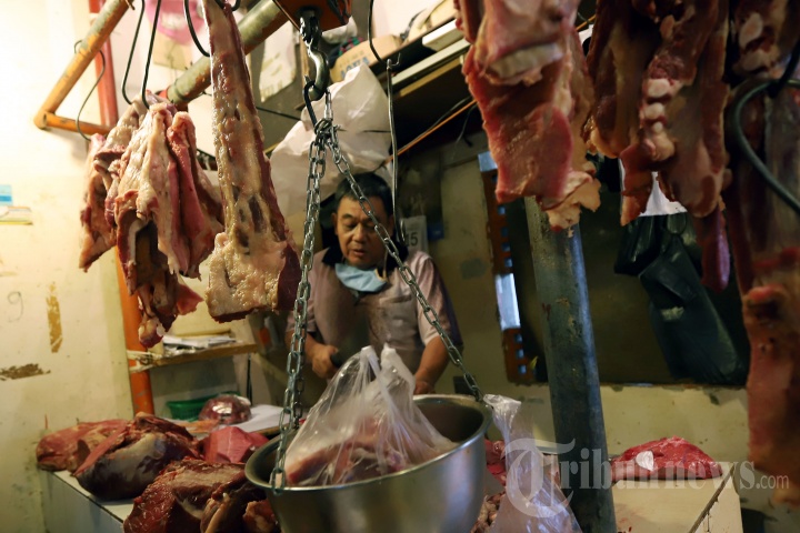 Pedagang saat menimbang daging sapi di Pasar Senen, Jakarta Pusat, Sabtu (17/5/2020). 10 hari jelang Hari Raya Idul Fitri harga daging sapi naik menjadi Rp 130 ribu meski begitu permintaan untuk daging sapi tetap tingi. Tribunnews/Jeprima