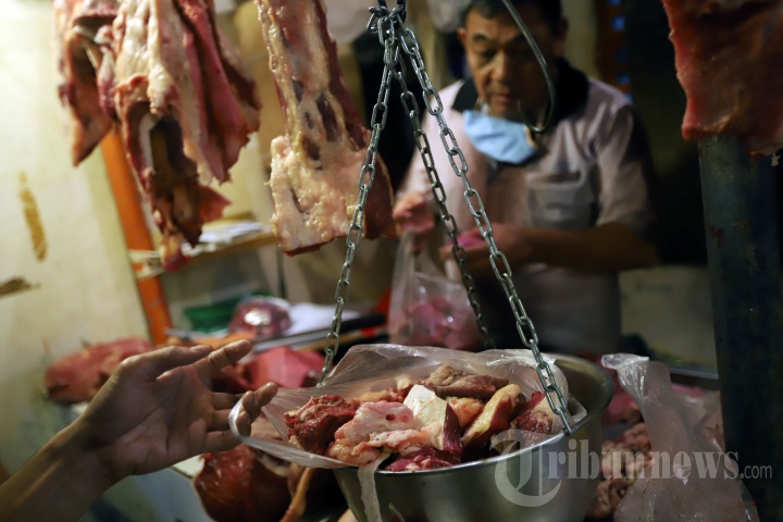 Pedagang saat menimbang daging sapi di Pasar Senen, Jakarta Pusat, Sabtu (17/5/2020). 10 hari jelang Hari Raya Idul Fitri harga daging sapi naik menjadi Rp 130 ribu meski begitu permintaan untuk daging sapi tetap tingi. Tribunnews/Jeprima