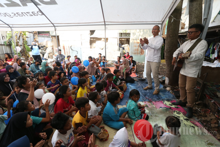 Sejumlah anak-anak di Kampung Pemulung Pondok Aren, Tangerang Selatan, Senin (25/3/2024). tengah mengikuti Safari Dongeng Ramadan (SADORA), program khusus Ramadan dari McDonald?s Indonesia yang mengangkat kisah teladan dan inspiratif dari para nabi dan sahabatnya. TRIBUNNEWS/HO
