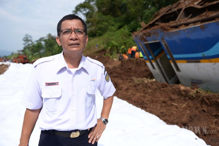 Kepala Humas PT. Kereta Api, Sugeng Priyono mengamati jalur kereta api yang amblas di Kampung Terung, Desa Mekarsari, Kecamatan Kadipaten, Kabupaten Tasikmalaya, Jawa Barat, Minggu (6/4/2014). PT.Kereta Api Indonesia (KAI) memperkirakan mampu menyelesaikan perbaikan rel kereta yang amblas dalam dua hari ke depan. (SUPER BALL/Feri Setiawan)