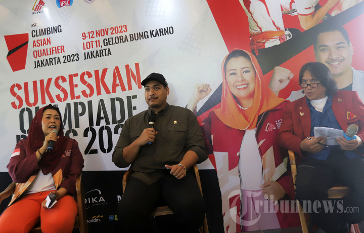 Ketua Umum (Ketum) Federasi Panjat Tebing Indonesia (FPTI) Yenny Wahid bersama Menteri Pemuda dan Olahraga Republik Indonesia (Menpora RI) Dito Ariotedjo saat konferensi pers IFSC Asian Qualifier 2023 di On3 Cafe Hutan Kota Gelora Bung Karno (GBK) Jakarta, Selasa (7/11/2023). Yenni menerangkan ada 95 atlet dari 15 negara di Asia yang akan bertanding dalam Asian Qualifier 2023 dan kategori yang akan dipertandingkan yaitu speed putra dan putri serta lead & boulder combine putra dan putri. Indonesia akan mengikutsertakan 12 atlet, meliputi tiga atlet putra dan tiga atlet putri untuk kategori speed, serta tiga atlet putri dan tiga atlet putra untuk kategori lead & boulder (combine). Tribunnews/Jeprima