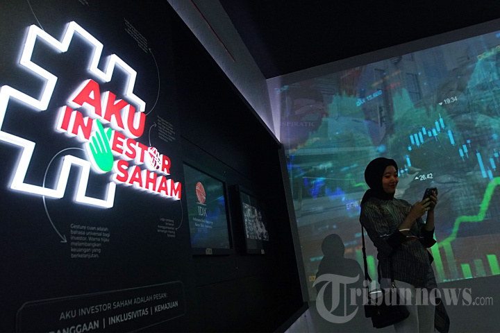 Pengunjung bermain hp dengan backround layar pergerakan saham di Bursa Efek Indonesia (BEI), Jakarta, Selasa (21/5/2024). Indeks Harga Saham Gabungan (IHSG) Bursa Efek Indonesia (BEI) pada Selasa sore, ditutup turun mengikuti pelemahan bursa saham kawasan Asia dan global. IHSG ditutup melemah 80,64 poin atau 1,11 persen ke posisi 7.186,04. Sementara kelompok 45 saham unggulan atau indeks LQ45 turun 16,96 poin atau 1,87 persen ke posisi 891,58. Tribunnews/Jeprima