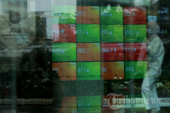 Karyawan melintas dengan latar layar pergerakan indeks harga saham gabungan (IHSG) di gedung Bursa Efek Indonesia (BEI), Jakarta Selatan, Senin (3/1/2022). Pembukaan perdagangan Bursa Efek Indonesia pada 2022 dilakukan oleh Presiden Joko Widodo. IHSG ditutup naik 1,27 persen atau 83,83 poin menjadi 6.665,31 pada sesi II. TRIBUNNEWS/IRWAN RISMAWAN