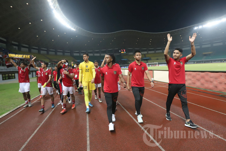 Seluruh pemain Timnas Indonesia U-19 berkeliling lapangan menyapa para pendukung usai berhasil mengalahkan Brunei pada laga kedua Piala AFF U-19 di Stadion Patriot Candrabhaga, Bekasi, Senin (4/7/2022). Hingga wasit meniup pluit panjang Indonesia berhasil unggul 7-0 dari Brunei. Tribunnews/Jeprima