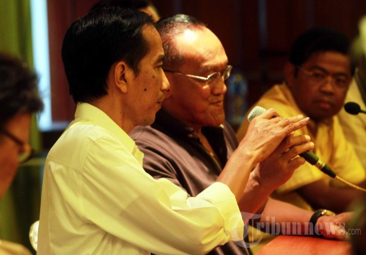 Ketua Umum Partai Golkar yang juga Capres dari Partai Golkar, Aburizal Bakrie (dua kanan) bersama Capres dari Partai Demokrasi Indonesia Perjuangan (PDIP), Joko Widodo (Jokowi) memberikan keterangan kepada wartawan usai melakukan pertemuan tertutup di Kantor DPP Golkar, Slipi, Jakarta Barat, Sabtu (12/4/2014). Dalam pertemuan itu, Golkar dan PDIP berjanji untuk menjaga agar Pemilu Presiden (Pilpres) berjalan aman seperti Pemilu Legislatif (Pileg) kemarin. Warta Kota/Adhy Kelana