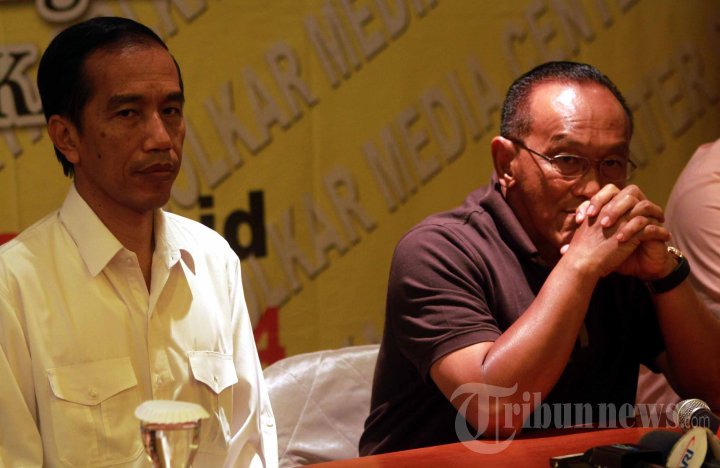 Ketua Umum Partai Golkar yang juga Capres dari Partai Golkar, Aburizal Bakrie (kanan) bersama Capres dari Partai Demokrasi Indonesia Perjuangan (PDIP), Joko Widodo (Jokowi) memberikan keterangan kepada wartawan usai melakukan pertemuan tertutup di Kantor DPP Golkar, Slipi, Jakarta Barat, Sabtu (12/4/2014). Dalam pertemuan itu, Golkar dan PDIP berjanji untuk menjaga agar Pemilu Presiden (Pilpres) berjalan aman seperti Pemilu Legislatif (Pileg) kemarin. Warta Kota/Adhy Kelana