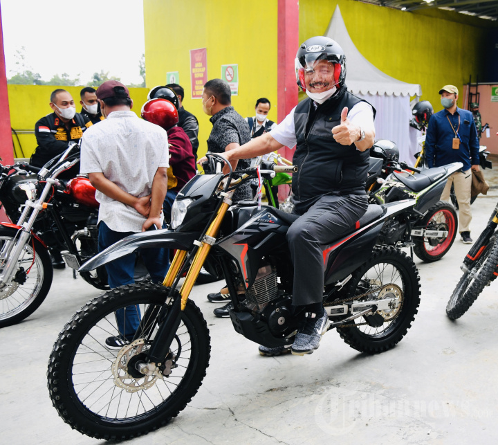 Menko Bidang Kemaritiman dan Investasi, Luhut Binsar Pandjaitan bersiap mengendarai sepeda motor saat mendampingi Presiden Joko Widodo melakukan kunjungan kerja (kunker) ke Provinsi Sumatera Utara, Rabu (2/2/2022). Presiden Jokowi menunggangi Kawasaki W175 custom dari Simpang Sibisa, Kabupaten Toba, menuju Kawasan Pantai Bebas Parapat, Kabupaten Simalungun, sejauh 11 kilometer. Tribunnews/HO/Biro Pers Setpres/Laily Rachev