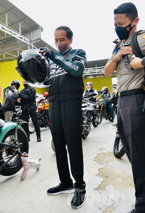 Presiden Joko Widodo bersiap mengendarai sepeda motor saat kunjungan kerja (kunker) ke Provinsi Sumatera Utara, Rabu (2/2/2022). Presiden Jokowi menunggangi Kawasaki W175 custom dari Simpang Sibisa, Kabupaten Toba, menuju Kawasan Pantai Bebas Parapat, Kabupaten Simalungun, sejauh 11 kilometer. Tribunnews/HO/Biro Pers Setpres/Laily Rachev