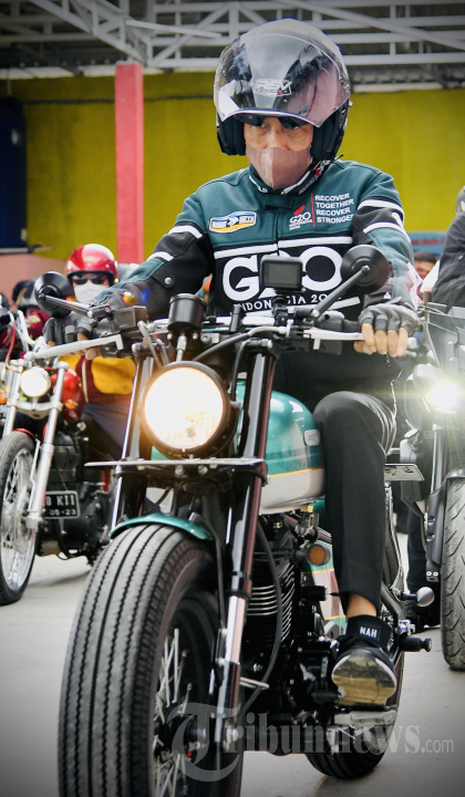 Presiden Joko Widodo bersiap mengendarai sepeda motor saat kunjungan kerja (kunker) ke Provinsi Sumatera Utara, Rabu (2/2/2022). Presiden Jokowi menunggangi Kawasaki W175 custom dari Simpang Sibisa, Kabupaten Toba, menuju Kawasan Pantai Bebas Parapat, Kabupaten Simalungun, sejauh 11 kilometer. Tribunnews/HO/Biro Pers Setpres/Laily Rachev