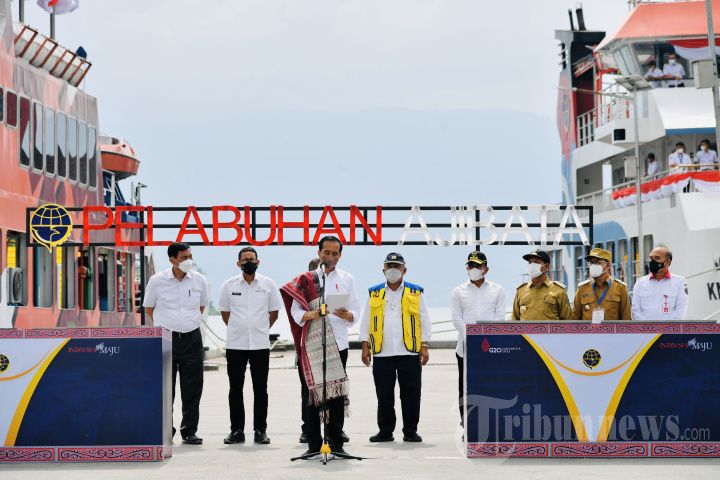 Presiden Joko Widodo meresmikan tujuh pelabuhan penyeberangan dan empat kapal motor penumpang (KMP) di kawasan dermaga Pelabuhan Ajibata, Kabupaten Toba, Sumatera Utara, Rabu (2/2/2022). Presiden Jokowi berharap pelabuhan penyeberangan dan KMP yang telah diresmikan dapat mendukung keberadaan Danau Toba sebagai salah satu destinasi wisata unggulan di Tanah Air. Adapun tujuh pelabuhan yang diresmikan itu yakni Pelabuhan Ajibata dan Balige di Kabupaten Toba, Pelabuhan Tiga Ras di Kabupaten Simalungun, Pelabuhan Simanindo di Kabupaten Samosir, Pelabuhan Marbun Toruan/Baktiraja di Kabupaten Humbang Hasundutan, Pelabuhan Muara di Kabupaten Tapanuli Utara, dan Pelabuhan Tongging di Kabupaten Karo. Sedangkan empat KMP yang diluncurkan yaitu KMP Pora-Pora, KMP Kaldera Toba, Bus Air KMP Asa-asa, dan Bus Air KMP Jurung-Jurung. Tribunnews/HO/Biro Pers Setpres/Laily Rachev