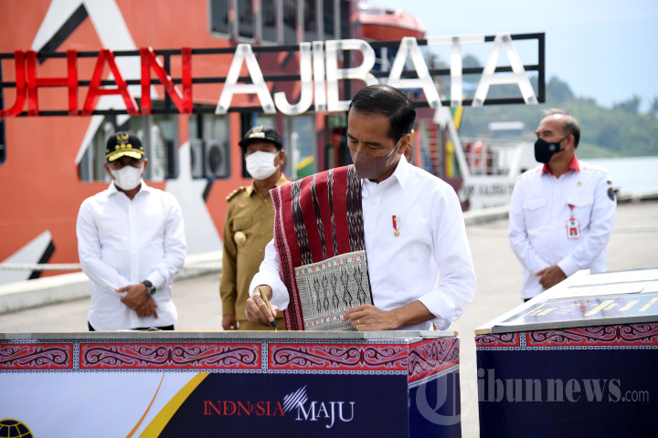 Presiden Joko Widodo meresmikan tujuh pelabuhan penyeberangan dan empat kapal motor penumpang (KMP) di kawasan dermaga Pelabuhan Ajibata, Kabupaten Toba, Sumatera Utara, Rabu (2/2/2022). Presiden Jokowi berharap pelabuhan penyeberangan dan KMP yang telah diresmikan dapat mendukung keberadaan Danau Toba sebagai salah satu destinasi wisata unggulan di Tanah Air. Adapun tujuh pelabuhan yang diresmikan itu yakni Pelabuhan Ajibata dan Balige di Kabupaten Toba, Pelabuhan Tiga Ras di Kabupaten Simalungun, Pelabuhan Simanindo di Kabupaten Samosir, Pelabuhan Marbun Toruan/Baktiraja di Kabupaten Humbang Hasundutan, Pelabuhan Muara di Kabupaten Tapanuli Utara, dan Pelabuhan Tongging di Kabupaten Karo. Sedangkan empat KMP yang diluncurkan yaitu KMP Pora-Pora, KMP Kaldera Toba, Bus Air KMP Asa-asa, dan Bus Air KMP Jurung-Jurung. Tribunnews/HO/Biro Pers Setpres/Lukas