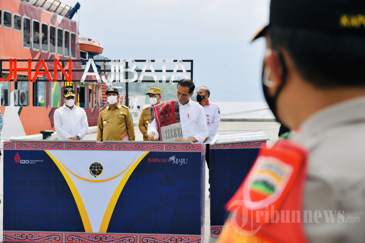 Presiden Joko Widodo meresmikan tujuh pelabuhan penyeberangan dan empat kapal motor penumpang (KMP) di kawasan dermaga Pelabuhan Ajibata, Kabupaten Toba, Sumatera Utara, Rabu (2/2/2022). Presiden Jokowi berharap pelabuhan penyeberangan dan KMP yang telah diresmikan dapat mendukung keberadaan Danau Toba sebagai salah satu destinasi wisata unggulan di Tanah Air. Adapun tujuh pelabuhan yang diresmikan itu yakni Pelabuhan Ajibata dan Balige di Kabupaten Toba, Pelabuhan Tiga Ras di Kabupaten Simalungun, Pelabuhan Simanindo di Kabupaten Samosir, Pelabuhan Marbun Toruan/Baktiraja di Kabupaten Humbang Hasundutan, Pelabuhan Muara di Kabupaten Tapanuli Utara, dan Pelabuhan Tongging di Kabupaten Karo. Sedangkan empat KMP yang diluncurkan yaitu KMP Pora-Pora, KMP Kaldera Toba, Bus Air KMP Asa-asa, dan Bus Air KMP Jurung-Jurung. Tribunnews/HO/Biro Pers Setpres/Laily Rachev