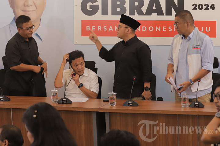Wakil Ketua Tim Kampanye Nasional (TKN) Habiburokhman bersama Juru Bicara Kementerian Pertahanan Dahnil Anzar Simanjuntak dan Wakil Komandan Alpha TKN, Fritz Edward Siregar usai menjadi narasumber konferansı pers terkait adanya ancaman di media center, Kawasan Kertanegara, Jakarta, Selasa (13/2/2024). Konferensi pers ini terkait dugaan adanya ancaman terhadap Jubir Kemenhan Dahnil Anzhar Simanjuntak yang sering membantah mengenai dugaan korupsi pesawat jet tempur Mirage 2000-5 bekas dari Qatar yang menyeret nama calon presiden (capres) Prabowo Subianto. Dalam keteranganya Habiburokhman memperlihatkan pesan singkat bernada ancaman yang ditujukan kepada Dahnil Anzhar Simanjuntak. Tribunnews/Jeprima