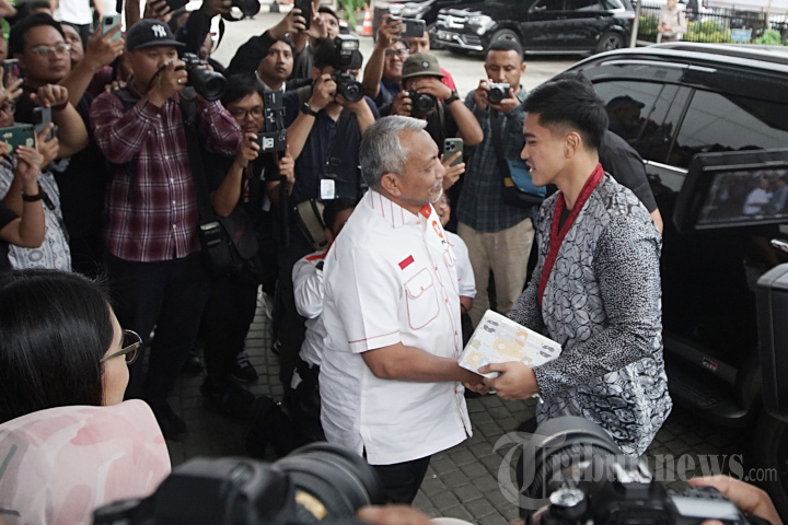 Presiden Partai Keadilan Sejahtera (PKS) Ahmad Syaikhu menyambut kedatangan Ketua Umum Partai Solidaritas Inedonesia (PSI) Kaesang Pangarep beserta elit partai di kantor DPP PKS, Jakarta Selatan, Senin (8/7/2024). Kaesang Pangarep bersama elit partai PSI berkunjung ke DPP PKS dalam rangka untuk tetap menjalin silaturahmi serta mencari kesepahaman mengenai isu politik sekaligus membahas potensi kolaborasi dalam Pilkada serentak 2024. Tribunnews/Jeprima