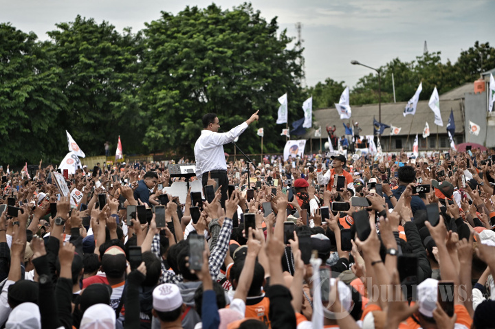 Capres nomor urut 1, Anies Baswedan melanjutkan kampanye akbar hari kedua di Lapangan Stadion Mini Cikarang, Jawa Barat, Senin (22/1/2024). Kampanye yang dihadiri ribuan pendukungnya, Anies Baswedan mengatakan fokusnya adalah mempermudah warga mendapatkan pekerjaan. Dia menjelaskan bahwa benar banyak investasi tetapi hal itu bersifat padat modal. TRIBUNNEWS/TIM AMIN