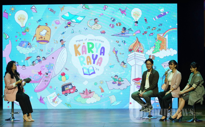 Kepala Sekolah St. Laurensia Yunitalia Subroto, artis dan penulis cerita anak Marcella Simon dan Co-Founder Karya Raya Ernest Junius W menjadi pembicara pada sesi talk show Festival Karya Raya 2024 di Gedung Teater Kecil Taman Ismail Marzuki, Jakarta Pusat, Jumat (27/9/2024). Festival Karya Raya 2024 berlangsung pada 27 - 29 September 2024 yang dieselenggarakan oleh Bookabook.id untuk mendukung serta meningkatkan literasi, minat baca, dan kreativitas anak-anak di Indonesia. Tribunnews/Jeprima