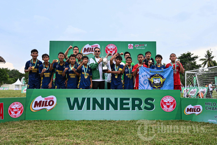 FINAL KATEGORI U10 - Business Executive Officer Beverages & Culinary Dairy Business Unit PT Nestle Indonesia Alaa Shaaban, Ketua Yayasan Garuda Anak Nusantara Endra Gunawan bersama Sr. Brand Executive Nestle MILO Arbie Hasyim Ashari menyerahkan piala dan medali kepada Randhika FC, Kudus juara 1 U-12 MILO National Championship 2025 di Stadion Ciracas, Jakarta Timur, Minggu (16/2/2025). Pada tahun ketiga penyelenggaraannya, MILO National Championship 2025 yang terbagi dalam dua kategori usia, yaitu U-10 dan U-12 dan diikuti lebih dari 10.000 peserta yang berasal dari 19 kota di Indonesia. TRIBUNNEWS/HO/Dok MILO