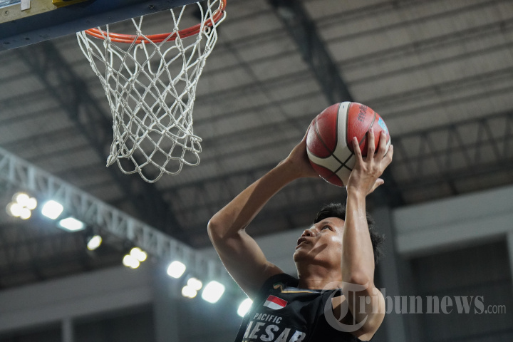 Pebasket Pacific Caesar, Christian Yuda melakukan lay up ke jaring Kesatria Muda Bengawan Solo dalam lanjutan IBL 2024 di Sritex Arena pada Minggu (19/5/2024) sore. Kesatria Bengawan Solo kalahkan Pacific Caesar 90-81 dan menjadi kemenangan ke-14 berturut-turut di IBL 2024. TRIBUNNEWS/Muhammad Nursina