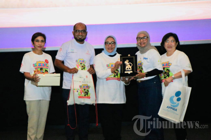 HARI ANAK NASIONAL - Dalam rangkaian acara peringatan Hari Anak Nasional (HAN) 2025 Menteri PPPA, Arifatul Choiri Fauzi menerima apresiasi dan dukungan dari Asosiasi Perusahaan Bernutrisi untuk Ibu dan Anak (APPNIA) yang diserahkan oleh Nani Hidayani selaku Ketua Umum APPNIA bersama dengan dr. Poppy Kumala selaku Direktur Eksekutif APPNIA dan dr. Sarah Angelique selaku anggota Excom APPNIA. Dalam rangka memperingati Hari Anak Nasional (HAN) 2025, Kementerian Pemberdayaan Perempuan dan Perlindungan Anak (PPPA) bersama sejumlah dunia usaha termasuk Asosiasi Perusahaan Produk Bernutrisi untuk Ibu dan Anak (APPNIA) menggelar kegiatan ?Hari Anak Nasional 2025 - Anak Indonesia Bersaudara? di Bundaran HI, Jakarta. TRIBUNNEWS/HO